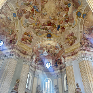 Today drove 4 hours through the Czechia county side to Brno, another random place to stay. Must have driven through 50 small villages, nearly all had a huge church, and nearly all had various war stories posted on information boards. But what was interesting was that every village had speakers mounted on telegraph poles, and in most cases music was being played. So it turns out that the speakers were installed in late 40's & 50's as a tool for civil defence in case of WW3. The idea was that commercial radio stations would be obliterated and the local PA system would be used to control the populace before, during and after the attack. It would be used to announce the emergency, to order people in shelters, to announce the end of attack and so on. During the socialist era they were also used to organise workers for daily work on collective farms. These announcements were at 6am each day. The PA system would play a brass band patriotic socialist number followed by an announcement like "comrades A, B and C will attend pigs, comrades D, E, F and G will milk cows, comrades ... will go to attend turnips in that field" etc. In addition the speaker box would play the official program of the Czechoslovak Radio. The wires were connected to the operation centre of the local Communist Party committee. In case of emergency, the committee could interrupt regular programming and use this system to make announcements and give orders. The idea was that such system, could not be easily obliterated during military nuclear conflict. There were very few families that actually owned a radio and most of the territory was not covered by radio broadcast anyway. Hence, specifically built local PA systems were useful for both purposes: propaganda and civil defence. And they had huge advantage over radio: one could not turn them off! It was odd driving through villages with the music playing through the speakers! One of the churches I stopped at was the Church of the name of the Virgin Mary in Křtiny which is an important pilgrimage destination in Moravia and one of the most celebrated shrines in Central Europe. In the crypt below the church is a vast ossuary where a special discovery was made in the early 1990s: twelve skulls painted with laurel wreaths and the letter T. (However the ossuary was shut when I visited!) Inside the church were some magnificent ceiling frescos from the 1700's.